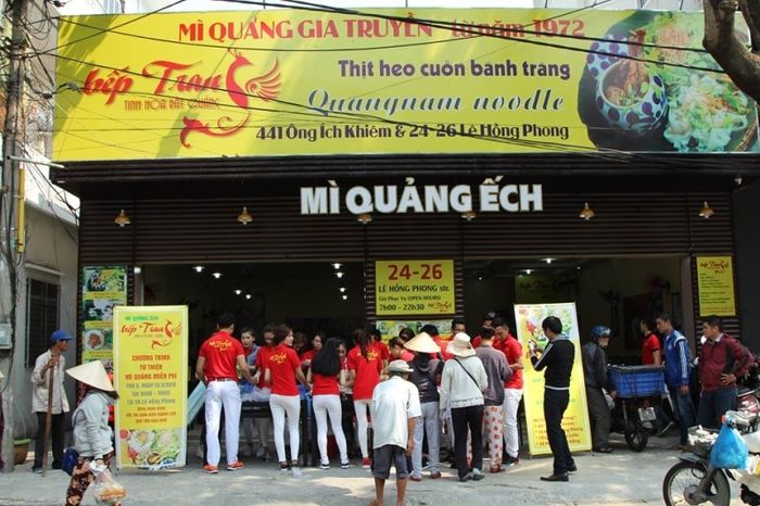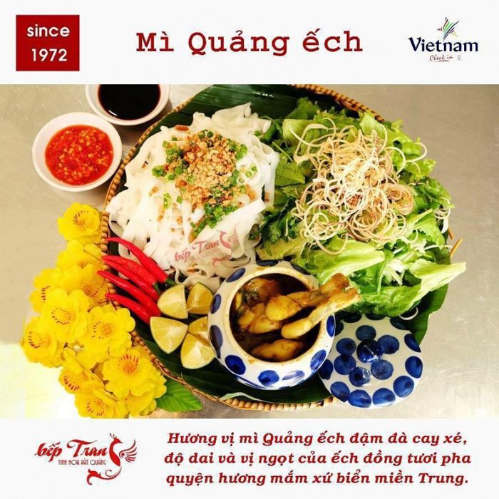 Mỳ Quảng là món ăn bình dân, mộc mạc, đặc trưng ở khu vực Quảng Nam - Đà Nẵng. Mỳ Quảng có rất nhiều loại như tôm thịt, gà, cá,.... Với sáng tạo của đầu bếp tại đây, người ta biến tấu thêm cả món mỳ ếch mới mẻ, độc đáo khiến du khách tò mò. Đặc biệt khi nhắc đến mỳ Quảng ếch, không thể không kể đến quán mỳ Quảng ếch Bếp Trang - một điểm ăn nổi tiếng tại Đà Nẵng.