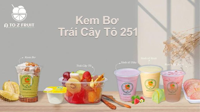 Tại Kem Bơ - Trái Cây Tô 251, bạn sẽ được thưởng thức kem bơ ngon lành, được làm từ 100% bơ tự nhiên. Hương vị kem bơ ở đây ngọt ngào, thanh mát và hấp dẫn. Kem thêm sự hòa quyện của đậu rang giòn, dừa khô và vị đặc trưng của sầu riêng, cùng với sinh tố bơ xay nhuyễn.... Tất cả hòa quyện tạo nên một hương vị đặc biệt, không thể nhầm lẫn. Kem tan chảy nhanh chóng, lan tỏa hương vị tinh tế ngay khi chạm vào lưỡi. Đặc biệt, menu của Kem Bơ - Trái Cây Tô 251 còn rất phong phú với nhiều loại kem và nước cho khách hàng lựa chọn.