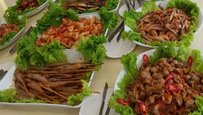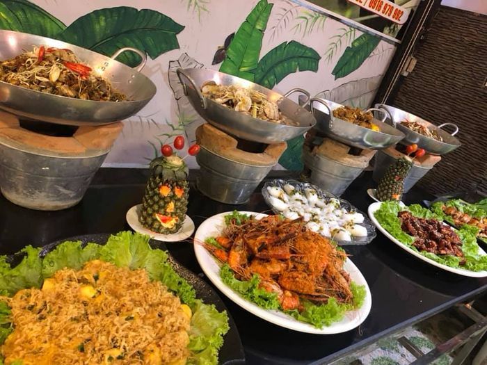 Đến đây, bạn sẽ bị thu hút ngay bởi những mâm hải sản, thịt, rau củ được tẩm ướp kỹ càng, đẹp mắt.. Menu buffet phong phú với hơn 30 món nướng ngon miệng, hấp dẫn như sò dẹo, ếch, vẹm xanh, cá kèo, bạch tuộc, dê, hàu, trứng mực….