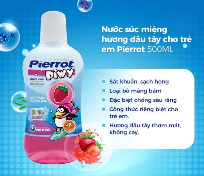 Bé thường thích thưởng thức đồ ngọt như nước ngọt, bánh kẹo, thức ăn nhanh,... nhưng không chỉ gây nguy cơ béo phì mà còn ảnh hưởng đến sức khỏe răng miệng, gây hại cho răng hàm, đặc biệt là sâu răng. Nước súc miệng trẻ em Pierrot Piwy là lựa chọn thông minh để chăm sóc răng miệng cho bé, kết hợp với việc sử dụng kem đánh răng hàng ngày. Hương vị dâu tây quyến rũ, không cay, giúp bé thúc đẩy thói quen chăm sóc răng miệng.