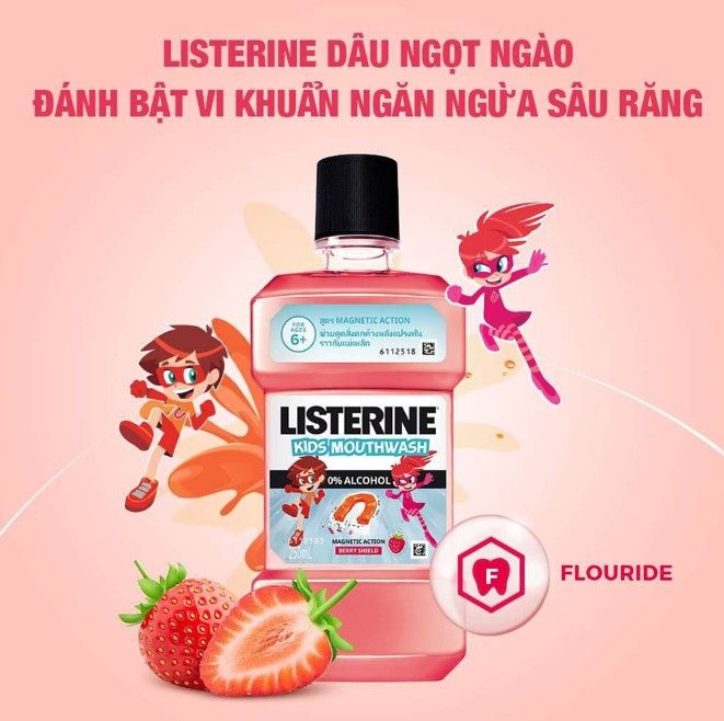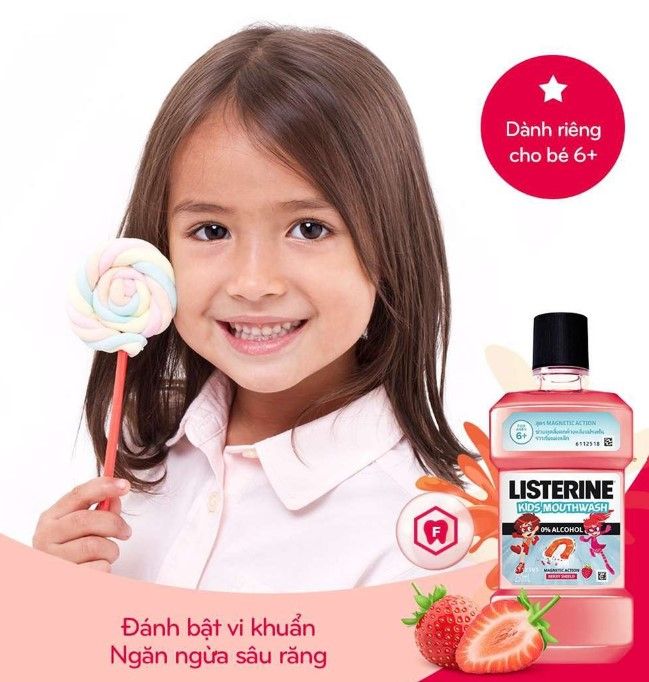 - Nước súc miệng Listerine Kids dành cho trẻ trên 6 tuổi, không cồn, hương thơm quả dâu tây, chứa Fluoride giúp răng chắc khỏe, ngăn sâu răng và diệt khuẩn gây hôi miệng.