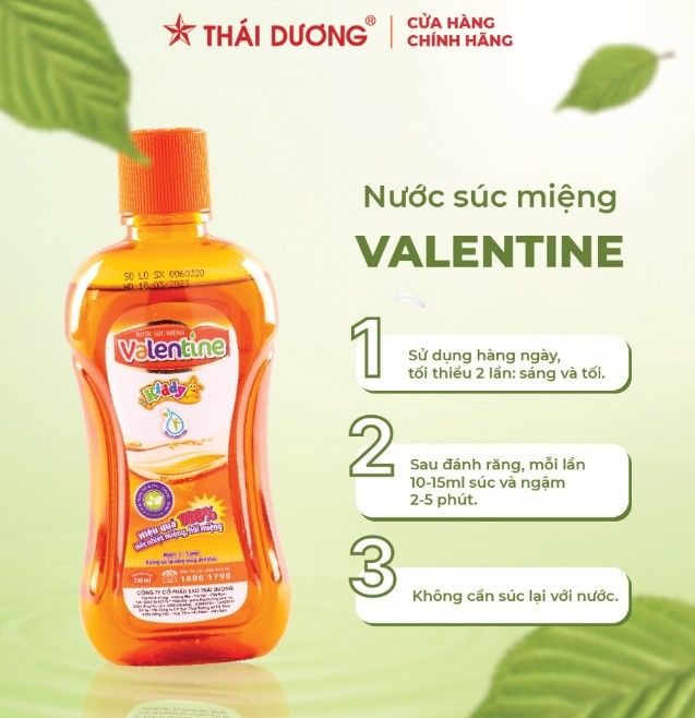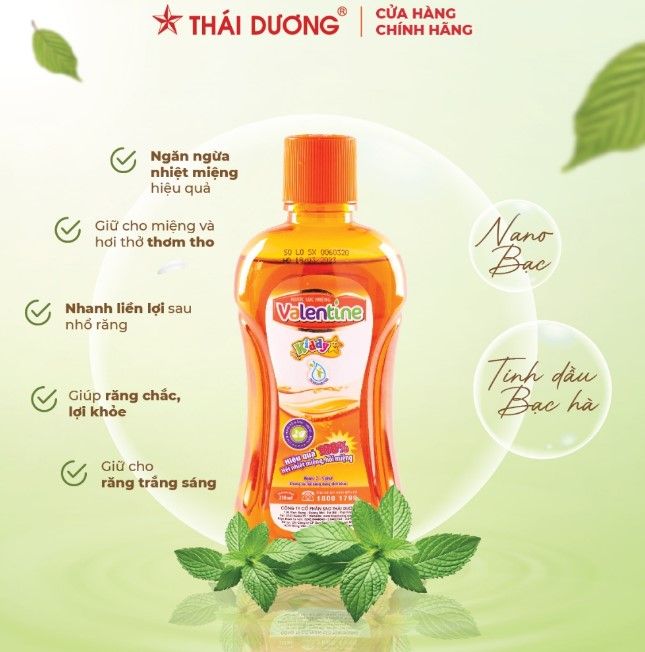 Thương hiệu Thái Dương, thành lập năm 2002, hoạt động chủ yếu trong lĩnh vực mỹ phẩm, dược phẩm và thực phẩm chăm sóc sức khỏe. Nước súc miệng trẻ em Valentine Kiddy Thái Dương chứa Nano bạc và công thức độc đáo không cồn, giúp diệt khuẩn, bảo vệ răng miệng, ngăn hồi miệng, nhiệt miệng, viêm lợi và sâu răng hiệu quả, mang lại hơi thở thơm mát, sảng khoái lâu dài.