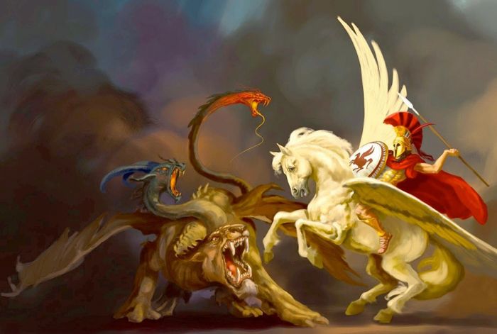 Cuối cùng, Chimera đã đối mặt với anh hùng Bellerophon, người cưỡi trên Pegasus - một con ngựa thần có đôi cánh. Nhờ Pegasus, anh hùng này né tránh được cú phun lửa của quái vật và tiêu diệt nó bằng những mũi tên chì. Khi xuyên qua lửa, chì tan chảy và làm cháy rụi ruột gan của Chimera. Homer đã mô tả Chimera trong Iliad như 'sinh vật thần thánh, với đầu sư tử phía trước, con rắn ở giữa và đuôi dê, thở ra ngọn lửa khôn nguôi'. Cả Hesiod và Apollodorus cũng miêu tả Chimera tương tự: ba đầu, với sư tử, dê và rắn.'