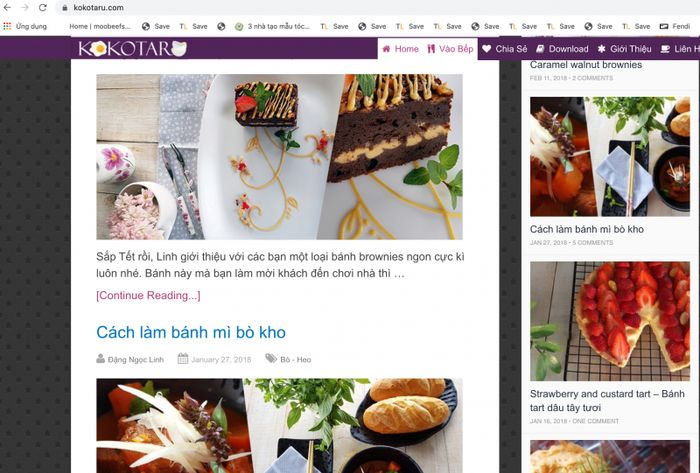 Những bạn đam mê bánh ngọt chắc chắn đã nghe tới danh tiếng của tiệm bánh Kotoharu và trang web Kokotaru.com chính là nơi chia sẻ các công thức làm bánh của chủ tiệm. Giao diện của Kokotaru rất cuốn hút với gam màu hồng ngọt ngào. Các món ăn được phân loại chi tiết thành các danh mục như: món chay, món Việt, món nước ngoài... Công thức và cách làm được trình bày rõ ràng, dễ hiểu, và hình ảnh minh họa rất sinh động.