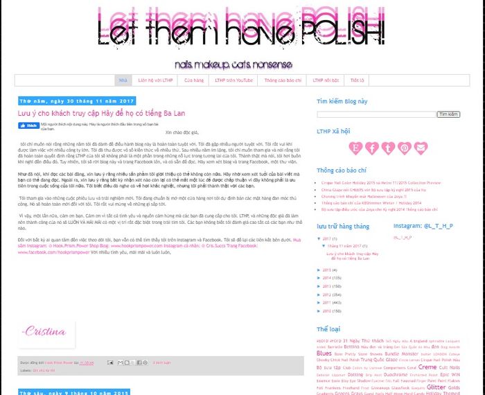 Blog của Christina, Let Them Have Polish, toàn diện với chủ đề về sơn móng tay. Trang web chia sẻ những điều thú vị và hài hước mà mọi cô gái quan tâm, đặc biệt là khi họ thực hiện nghệ thuật trên móng với các loại sơn khác nhau. Christina cung cấp hướng dẫn trên trang web và kênh YouTube của mình.