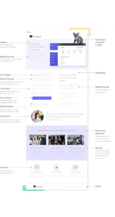 Một trang landing page không nên quá dài, cần đủ ý, và đặc biệt là có cấu trúc rõ ràng và logic để dẫn người đọc đến cuối cùng của trang. Một cấu trúc tiêu biểu của một trang landing page có khả năng chuyển đổi cao thường được sử dụng như sau: