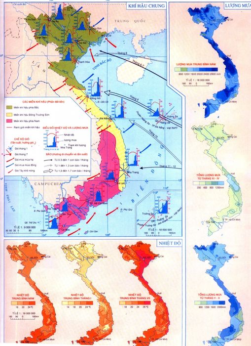 Bản đồ hiển thị đa dạng màu sắc và kí hiệu, được chú giải ở phía dưới giúp phân biệt rõ các vùng miền. Màu cam là vùng núi cao, màu vàng là vùng đất liền, màu xanh lá mạ là đồng bằng, còn xanh nước biển là vùng biển. Mũi tên xanh đỏ thể hiện rõ các mùa trong nước.