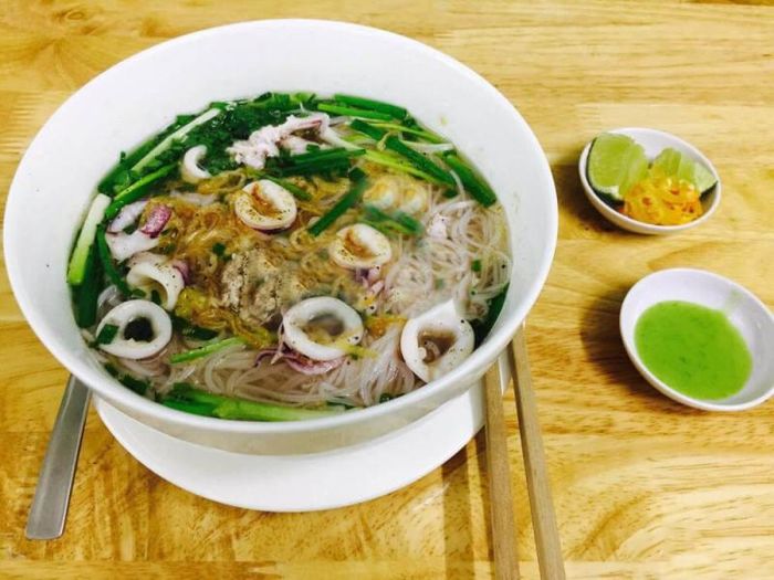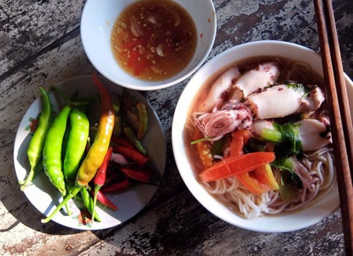 Just by mentioning its name, one can already recognize the main ingredient used to cook this dish: squid. The cook selects small squids, about 2 to 3 fingers in size. The broth used in this dish depends on the freshness of the squid; the fresher the squid, the sweeter the broth. Other simple ingredients include tomatoes, cilantro, culantro, scallions, and shallots. It can be said that Van Ninh squid vermicelli is a dish that embodies the essence of the homeland and is the pride of the people in the coastal area of Dai Lanh. Enjoying a bowl of Van Ninh squid vermicelli, you will feel the simple, rustic life of the people in this coastal region.