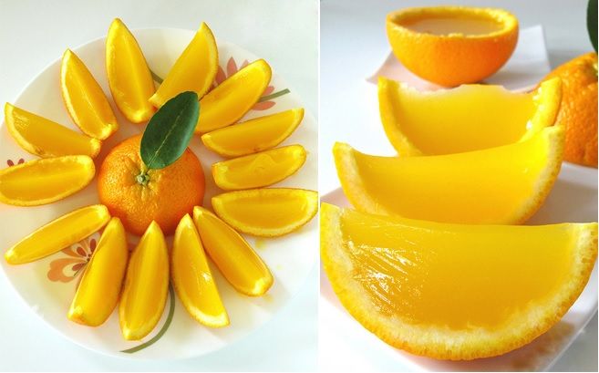 - Đổ thạch vào phần vỏ cam để thạch đông tự nhiên hoặc đặt vào ngăn mát tủ lạnh để thạch đông nhanh hơn. Khi ăn, cắt thành từng miếng nhỏ vừa ăn để thưởng thức món thạch cam mát lạnh cho ngày hè.