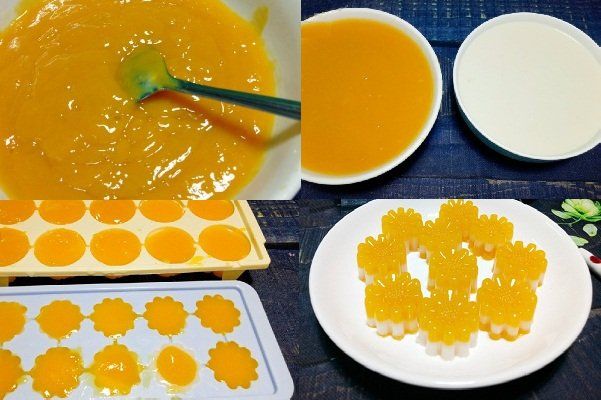 - Hòa bột làm thạch vào nước, đun sôi, sau đó thêm xoài và nước cốt chanh vào, khuấy đều.