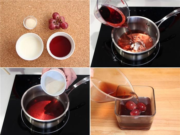 - Chuẩn bị nồi nước sạch, đổ bột rau câu và đường, khuấy đều cho đến khi tan hết bột. Sau đó đổ nước cốt nho vào nồi, khuấy đều và đun lửa nhỏ cho đến khi hỗn hợp sánh và trong suốt. Trong quá trình nấu, khuấy đều liên tục.
