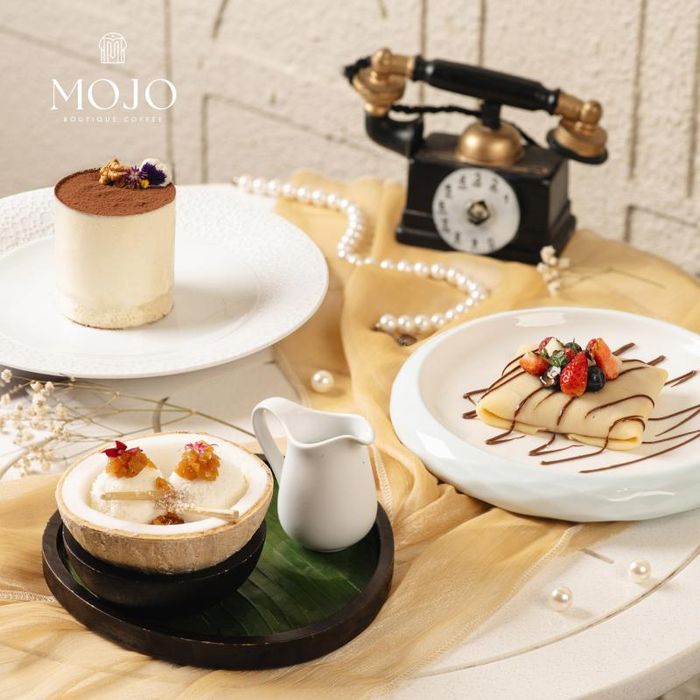 The menu at MOJO Boutique Coffee is diverse, including food, drinks, and pastries. Due to its prime location and elegant setting, the prices here are a bit higher than other places. A two-person tea set starts at 299k, offering 2-3 pastries alongside a pot of tea. The pastries here are beautifully presented, fresh, and soft, with the tiramisu crepe being a must-try.
