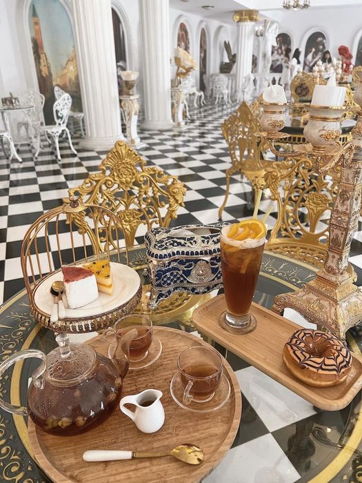 Looking for an elegant afternoon tea experience with a Renaissance European vibe? Look no further than Angel Mie Coffee. Stepping into this cafe feels like becoming a prince or princess in an old European fairytale. The interior is meticulously designed, with golden walls exuding an unmatched luxury. The grand staircase and red carpet add to the regal atmosphere, while candles, roses, and angel statues make you feel like you're in a heavenly garden—just as the name 'Angel Mie' suggests.