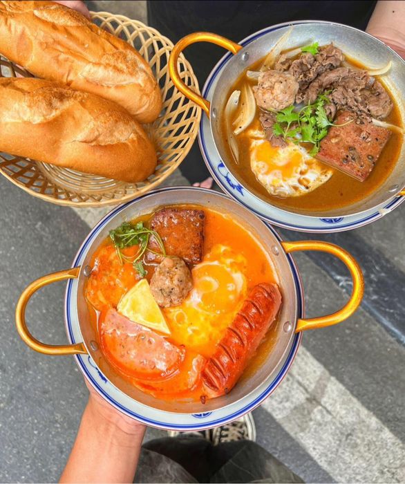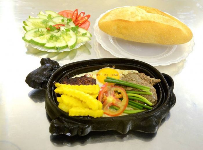 Bánh mì Ô Long là điểm đến truyền thống của người Hà Nội với bánh mì chảo hấp dẫn. Quán không chỉ nổi bật với hương vị ngon mà còn thu hút với cách bài trí độc đáo. Những nguyên liệu như khoai tây, trứng ốp la, cà chua, pate, xúc xích, bít tết... được sắp xếp tinh tế trong chảo gang hình con bò.