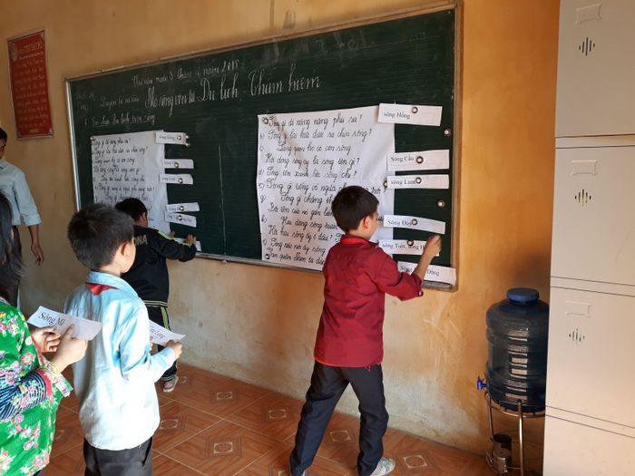 - Mỗi học sinh trong nhóm chuẩn bị trong tay cầm một tờ phiếu (giữ kín), khi nghe hiệu lệnh “bắt đầu” từ phía giáo viên, nhóm A (nhóm thả thơ) cử một người đưa ra một tờ phiếu cho một bạn ở nhóm B. Bạn nhận phiếu phải đọc thuộc cả khổ thơ (hoặc cả câu thơ) có câu (từ) ghi trên phiếu; khi đọc đúng sẽ được tính 10 điểm. Học sinh thả phiếu. Giáo viên tính tổng số điểm của nhóm thuộc thơ.