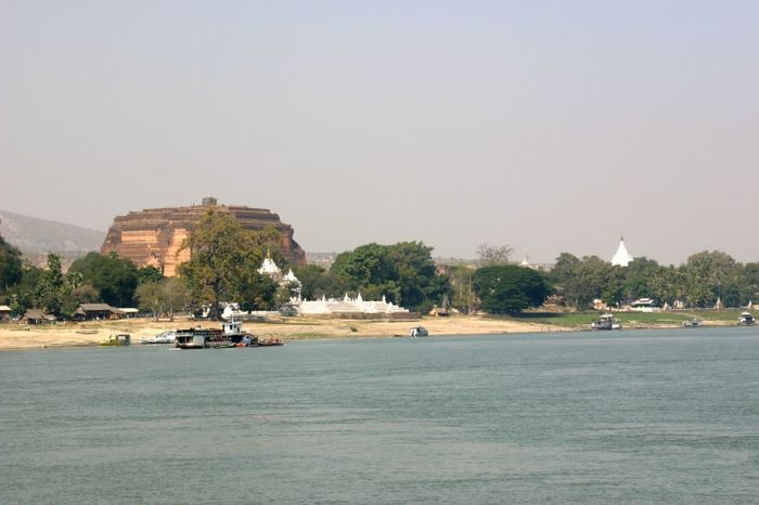 Bờ tây tiếp giáp với trung tâm thành phố Mandalay với những ngôi nhà sàn gỗ cao giữa vườn cây xanh, trong khi bờ đông mang đến hình ảnh sa mạc với bãi cát và những ngôi nhà lá đơn sơ. Cuộc sống ở đây diễn ra chậm rãi và an nhàn. Điểm đầu tiên trong hành trình thăm làng Mingun là phế tích chùa Mingun - một công trình tham vọng của vua Bodawpaya, đậm chất lịch sử và đẹp đẽ.