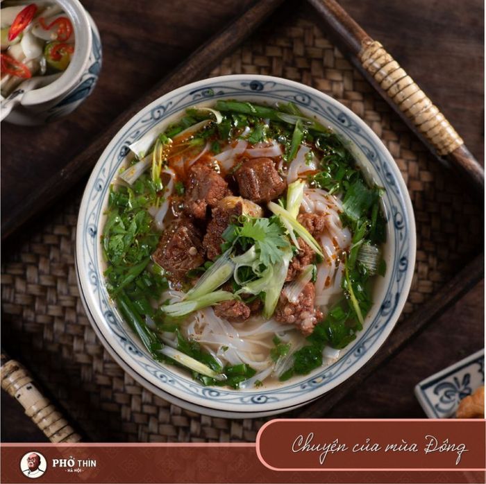 Quán Phở Thìn, biểu tượng ẩm thực Hà Nội, chuyên phục vụ món phở bò tái lăn. Trong suốt 30 năm, vẫn giữ vững sức hút với thực khách. Thực khách có thói quen ghé quán mỗi sáng cuối tuần. Thịt bò xào nhanh trên chảo lớn với hành tỏi, gừng tươi tạo nên hương vị đặc trưng. Nước dùng ngậy, phủ lớp mỡ nóng già, thêm hành lá xanh mướt. Địa chỉ: 13 Lò Đúc, Quận Hai Bà Trưng; Tầng 1 Tòa nhà CT9 Mỹ Đình, Quận Nam Từ Liêm; 61 Đinh Tiên Hoàng, Lý Thái Tổ, Hoàn Kiếm, Hà Nội. Điện thoại: 024 3200 6379. Website: http://phothinhanoi.vn/ Fanpage: www.facebook.com/phothinmydinh/ Giờ mở cửa: 05:00 - 21:00.
