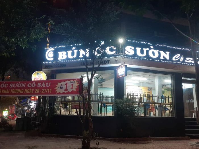 Quán bún ốc sườn Cô Sáu có không gian vừa phải, chỉ mở cửa từ sáng đến trưa. Quán thu hút thực khách bởi nước dùng thơm tự nhiên, thanh mát. Ốc mít và ốc nhồi giòn thơm, thịt bò tái và sườn nạc vô cùng, thịt chắc sụn giòn, ngon miệng. Mặc dù quán nhỏ nhưng sạch sẽ, bàn ghế và đồ dùng ngăn nắp, gọn gàng.