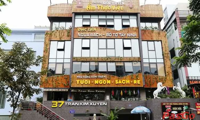 Nằm trên mặt đường Trần Kim Xuyến, Quận Cầu Giấy, Nhà hàng Sơn Thiên thu hút sự chú ý với hình ảnh con ngựa bạch mạnh mẽ tại hoa viên. Thực đơn đa dạng kết hợp hương vị biển cả và đặc sản núi rừng, tạo nên trải nghiệm ẩm thực tuyệt vời. Bò tơ Tây Ninh nướng tảng với hạt nêm, nước mắm và sốt độc quyền của nhà hàng hứa hẹn mang đến trải nghiệm ẩm thực đặc sắc.