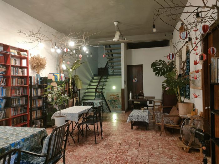 Điểm đặc biệt là quán không sử dụng máy lạnh và yêu cầu khách mang giày ra khỏi nhà. Bước vào đây, bạn sẽ nghe những giai điệu nhạc xưa, hòa mình trong không khí cổ điển, lý tưởng cho những ai muốn tìm kiếm sự yên bình để làm việc hoặc học tập. Cafe Nắng Bình Yên có một tủ sách phong phú, mang đến nhiều tác phẩm đa dạng về cả nội dung và ngôn ngữ, thích hợp cho khách muốn đọc sách và thư giãn với ly cà phê thơm ngon. Góc ngồi ưa thích nhất chính là gần ban công, với nhiều cây xanh, tạo ra không gian thoáng đãng và yên tĩnh.