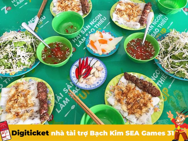 Bánh cuốn Lâm Hợi, thương hiệu đặc sản nổi tiếng ở Phú Thọ, hấp dẫn du khách với đĩa bánh nóng, nước mắm chua ngọt, miếng chả thịt nướng trên than hoa và rau sống tươi ngon.
