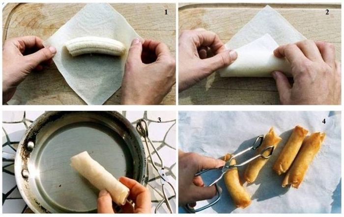 - Bước 2: Cuốn nem chuối bằng cách đặt chuối và phô mai lên mỗi miếng bánh đa nem, sau đó cuốn lại như cuốn nem chả.