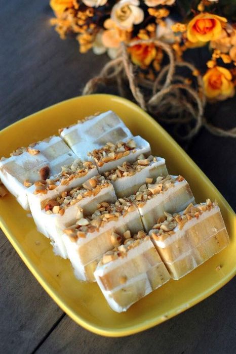 - Xếp chuối đã sơ chế vào hộp rồi rắc lạc rang, dừa nạo lên phía trên. Thực hiện liên tiếp như thế đến khi hết nguyên liệu và đậy kín hộp cho tủ lạnh đông cứng.