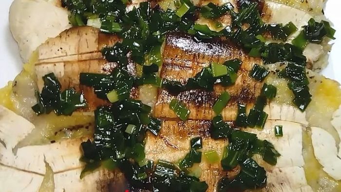 - Bước 4: Cắt chuối thành từng khúc hoặc cắt một đường dọc thân chuối rồi cho mỡ hành vào ăn nóng rất ngon.Vị ngọt và mặn, béo của mỡ hành, dẽo của chuối ăn là nghiền. Chuối nướng phết mỡ hành là món ăn vặt dân dã của miền tây nam bộ, có một vài nơi thì chuối nướng xong đem ép dẹp rồi cho mỡ hành lên.