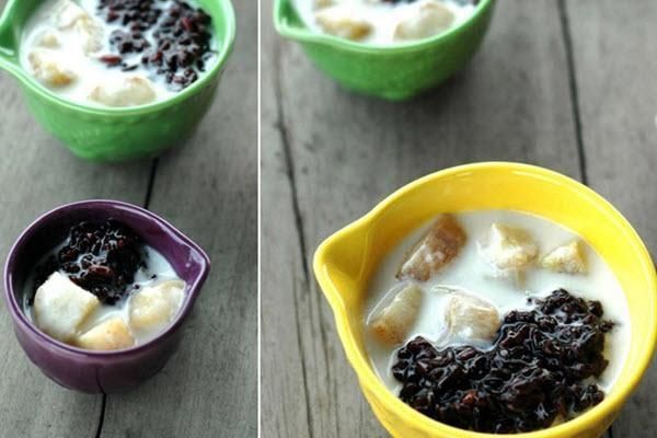 - Đặt nếp cẩm vào bát và cho chuối, nước cốt dừa, dừa tươi nạo nhỏ, dừa khô và thưởng thức.