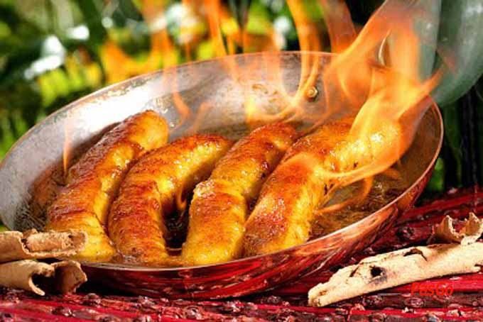 - Đến khi chuối mềm thì bạn rót rượu Rum, đợi cho rượu nóng thì nghiêng chảo để lửa bắt vào chảo chuối, đến khi lửa tắt là được.