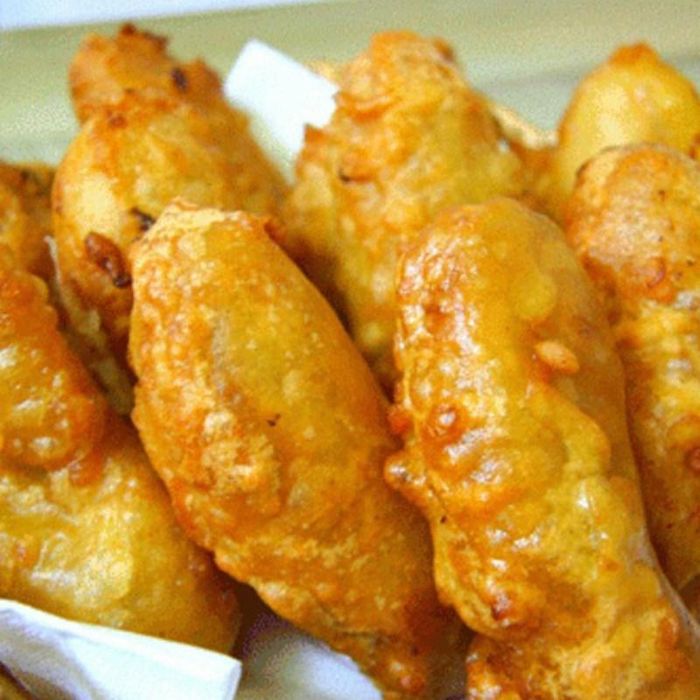- Nhúng chuối vào hỗn hợp bột lần 1, sau đó chiên vàng và vớt ra để ráo dầu.