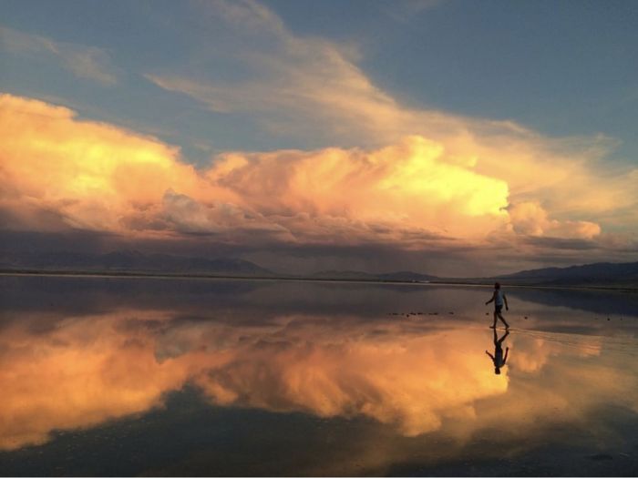 Một khoảnh khắc kỳ diệu, một người đi bộ trên cánh đồng muối ở Utah. Bạn có nghĩ rằng họ đang bước trên bầu trời không?