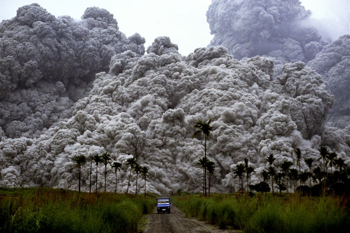 Hình ảnh dưới đây là cảnh núi lửa Pinatubo ở Philippines phun trào vào năm 1991, một sự kiện được xem là một trong những vụ phun trào lớn thứ hai trong thế kỷ 20. Trong lần hoạt động này, núi lửa Pinatubo đã phun trào khoảng 20 triệu tấn khí lưu huỳnh đioxit vào tầng bình lưu. Các nghiên cứu cho thấy lượng tro bụi từ sự kiện này lan tỏa trong vòng hơn 30 km, góp phần làm giảm nhiệt độ trung bình trên Trái Đất 0,5 độ C trong hai năm tiếp theo.