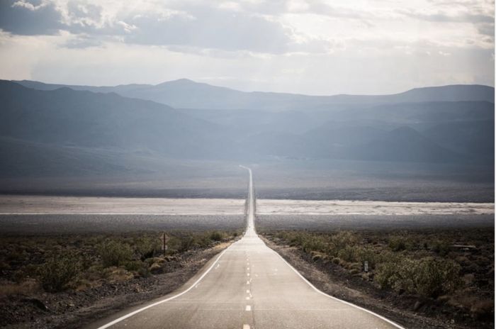Hình ảnh một đoạn đường dài, hoang vắng xuyên qua một phần của Vườn quốc gia Thung lũng Chết, California.