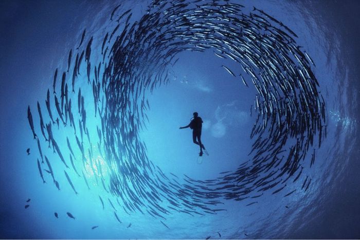 Khoảnh khắc kỳ diệu, đàn cá nhồng bơi thành một vong tròn lớn xung quanh người thợi nặn.