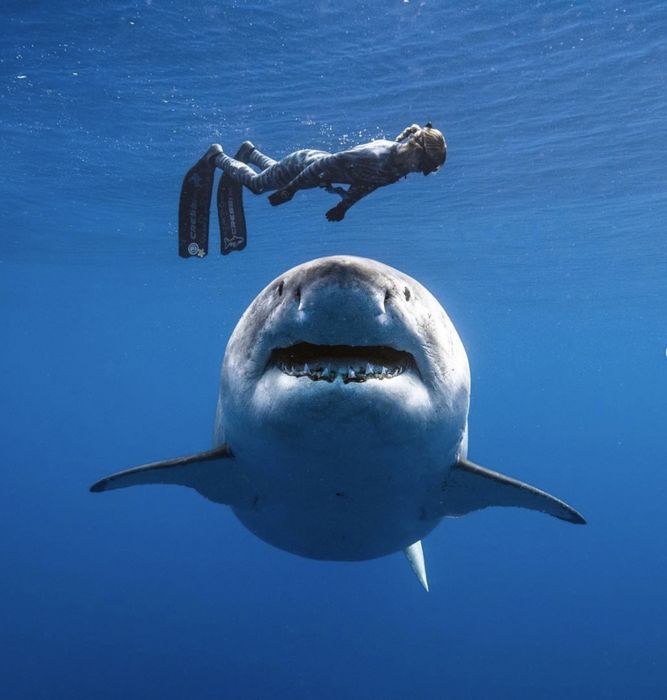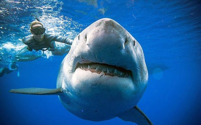 Một bức ảnh gần gũi, không có gì đáng sợ, như thể người thợ nặn và chú cá mập trắng to lớn đang trò chuyện với nhau trên bờ biển Hawaii.