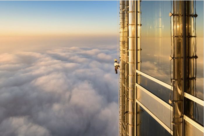 Người lau dọn cửa sổ làm việc tại mặt trước của toà nhà Burj Khalifa ở Các Tiểu vương quốc Ả Rập, Dubai. Nhiếp ảnh gia phát hiện ra người dọn dẹp này khi anh ta đang ở tầng thứ 124 của toà nhà, cách mặt đất khoảng 450 mét. Tòa nhà cao nhất thế giới nay, có hơn 24.000 cửa sổ, muốn làm sạch toàn bộ hệ thống cửa này, người lau dọn cần khoảng 3 tháng.