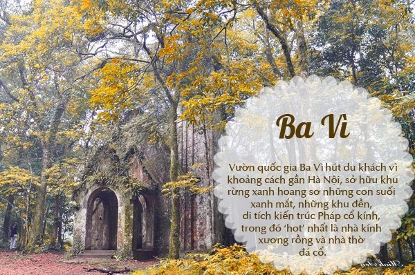 Đến với Ba Vì, bạn sẽ được khám phá rừng thiên nhiên Ba Vì, nhà thờ cổ Ba Vì, Thiên Sơn Suối Ngà, nhà kính xương rồng, đền Thượng, khu du lịch Ao Vua và nhiều điểm du lịch khác. Nơi đây là điểm đến cuối tuần thuận lợi cho các bạn yêu thiên nhiên và gia đình muốn có những ngày nghỉ cuối tuần trọn vẹn.