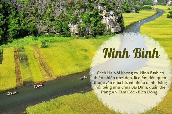 Với thiên nhiên hoang sơ, Ninh Bình là điểm đến nổi tiếng với nhiều cảnh đẹp như Tam Cốc - Bích Động, quần thể Tràng An, đầm Vân Long, chùa Bái Đính và những công trình kiến trúc độc đáo. Tỉnh này còn là quê hương của nhiều danh nhân lịch sử nổi tiếng như Đinh Bộ Lĩnh, Lê Hoàn, Lê Đại Hành.
