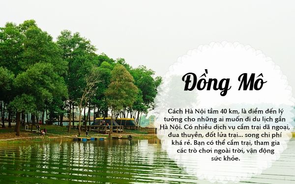 Đồng Mô kết hợp giữa du lịch văn hóa và nghỉ dưỡng, mang đến trải nghiệm độc đáo. Tại đây, bạn có thể tham gia các hoạt động như cắm trại, bơi lội, chèo thuyền, và đốt lửa trại với chi phí hợp lý. Nơi đây cũng tổ chức các hoạt động team building để tạo sự gắn kết giữa các thành viên.