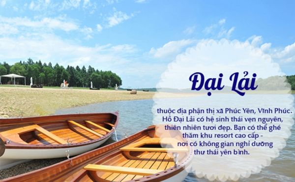 Đại Lải là điểm đến du lịch nổi tiếng tại thị xã Phúc Yên, tỉnh Vĩnh Phúc. Hồ Đại Lải mang đến trải nghiệm du lịch độc đáo với hệ sinh thái phong phú, thiên nhiên tuyệt vời. Tại đây, du khách có thể tận hưởng bãi biển nhân tạo, trải nghiệm đốt lửa trại và cắm trại dã ngoại, hoặc thư giãn tại các khu nghỉ dưỡng cao cấp.