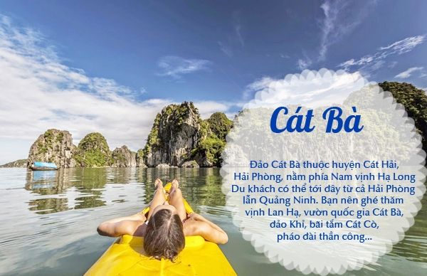 Đảo Cát Bà, một viên ngọc nằm phía nam Vịnh Hạ Long, thuộc huyện Cát Hải, tỉnh Hải Phòng. Nơi đây không chỉ có bãi tắm Cát Cò tuyệt vời, Vịnh Lan Hạ thơ mộng mà còn có vườn Quốc gia Cát Bà, đảo Khỉ... Du khách có thể tận hưởng kỳ nghỉ thú vị với đầy đủ dịch vụ du lịch.