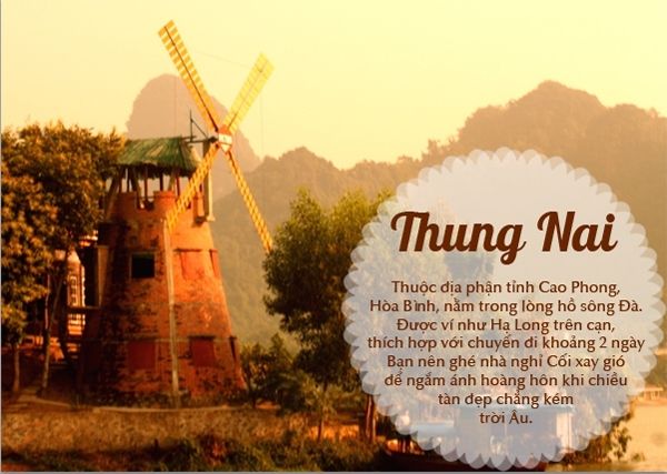 Thung Nai là điểm du lịch đẹp thuộc huyện Cao Phong, tỉnh Hòa Bình, nằm như một hòn đảo nhỏ giữa hồ sông Đà. Đây là địa điểm lý tưởng cho các chuyến đi thư giãn 2 ngày, nơi bạn có thể tận hưởng cảnh đẹp hoàng hôn tuyệt vời từ nhà nghỉ cối xay gió, giúp giải tỏa stress và thư giãn. Hãy ghé thăm để trải nghiệm không gian trữ tình, hòa mình vào bản hòa nhạc của thiên nhiên.