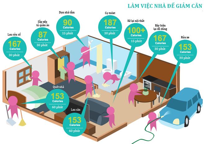 Theo khảo sát, làm các công việc nhà có thể tiêu tốn tới 600 calo mỗi 2 giờ, vượt xa so với việc chạy 5km chỉ tốn khoảng 374 calo. Công việc như lau kính, lau nhà đứng đầu danh sách với 115 calo/20 phút, không kém cạnh các bài tập cardio. Một buổi dọn dẹp đơn thuần trong 40 phút cũng có thể lấy đi 200 calo.