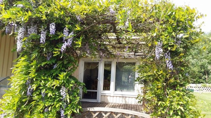 Ngôi nhà của bà nội nằm gần cánh đồng và có một khu vườn rộng với rau sạch và cây ăn quả. Phía trước là nhà thờ tổ cổ kính trang nghiêm. Mỗi sáng, khi thức dậy, tầm nhìn ra cỏ cây xanh tươi tắn tạo cho em một cảm giác bình yên.