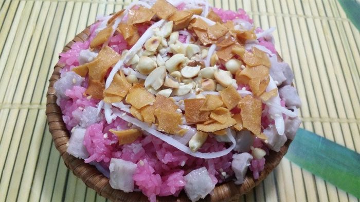 - Ngâm gạo nếp với nước lá cẩm 4-6 tiếng để có xôi có màu sắc và hương thơm. Hấp khoai môn chín, bào dừa non thành sợi. Rang đậu phộng và mè trắng.
