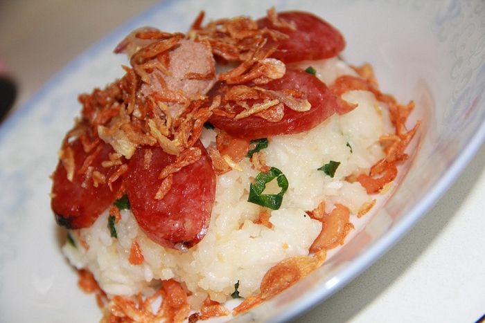 - Giờ món xôi và các nguyên liệu đã xong để lên bát. Bạn đơm xôi ra bát, rưới mỡ hành lên bề mặt xôi, cho lạp xưởng và hành phi lên trên là bạn đã có một bát xôi sắn thơm ngon, hấp dẫn.