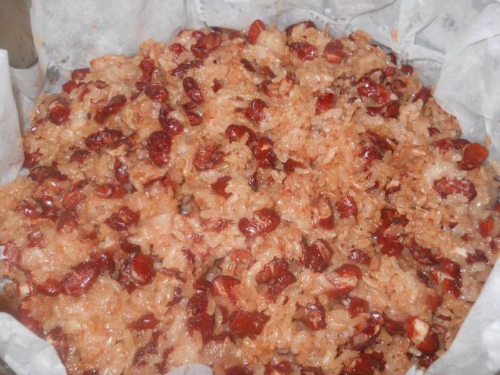 - Gạo sau khi xóc đều với 2 thìa muối, thêm lạc và dừa nạo, trộn đều.