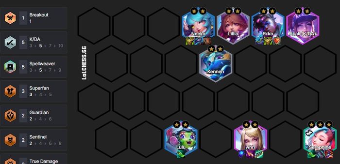 Với đội hình này, bạn sẽ nhanh chóng có sức mạnh mạnh mẽ với Seraphine 3 sao, từ đó dễ dàng chiến thắng nhờ vào sức mạnh tấn công ấn tượng của cô ấy. Hãy lên cấp và thêm những unit 4, 5 sao như Ahri và Sona để hoàn thiện đội hình. Bạn cũng có thể sử dụng 4 Vệ Binh để tạo ra sự bảo vệ mạnh mẽ hơn thay vì sử dụng K/DA như bình thường.
