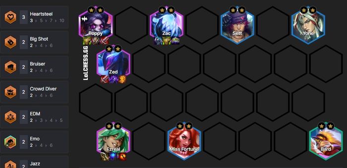 Sử dụng Heartsteel để hack tiền và trang bị. AD Flex giúp bạn có bộ khung ổn định ở cấp 8, sau đó thêm Lucian hay Ziggs ở cấp 9.